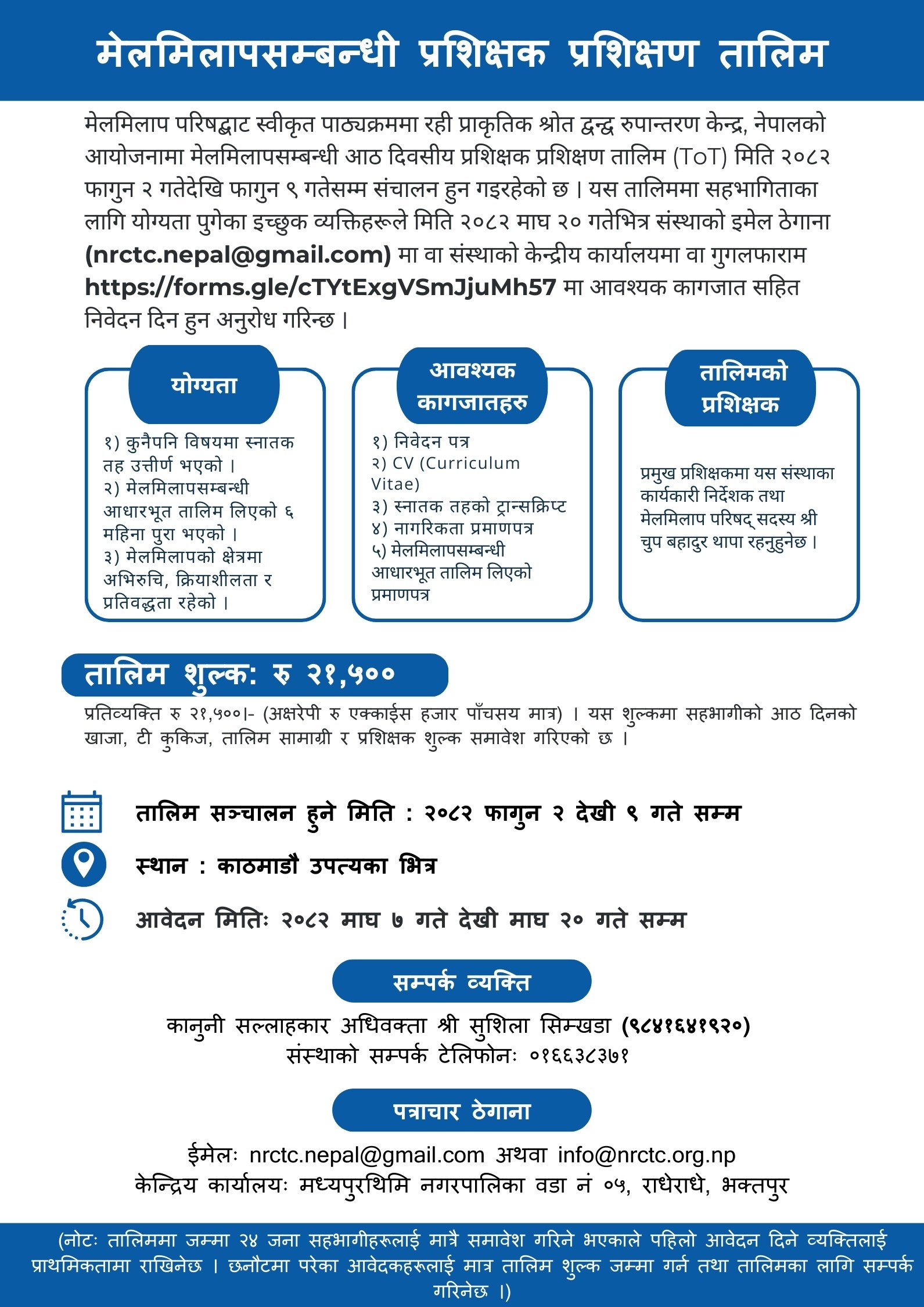 (नोटः तालिममा जम्मा २४ जना सहभागीहरूलाई मात्रै समावेश गरिने भएकाले पहिलो आवेदन दिने व्यक्तिलाई प्राथमिकतामा राखिनेछ । छनौटमा परेका आवेदकहरूलाई मात्र तालिम शुल्क जम्मा गर्न तथा तालिमका लागि सम्पर्क गरिनेछ ।)